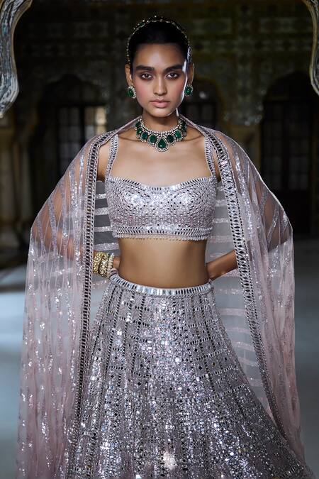 Crystal tassels at the hem and back of the blouse, Geometric mirror embroidery throughout the lehenga, Attached cancan for added volume