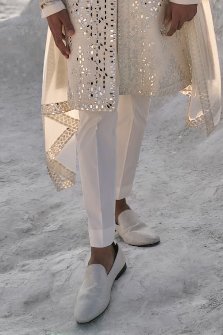 Off-white sherwani featuring mirror embroidery and a mandarin collar. Paired with a silk kurta and stretchable TR trouser.