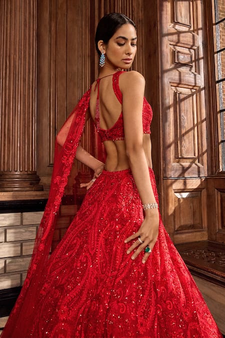 Red Net Sequins, Beads, Crystals Paisley Embroidered Bridal Lehenga Set