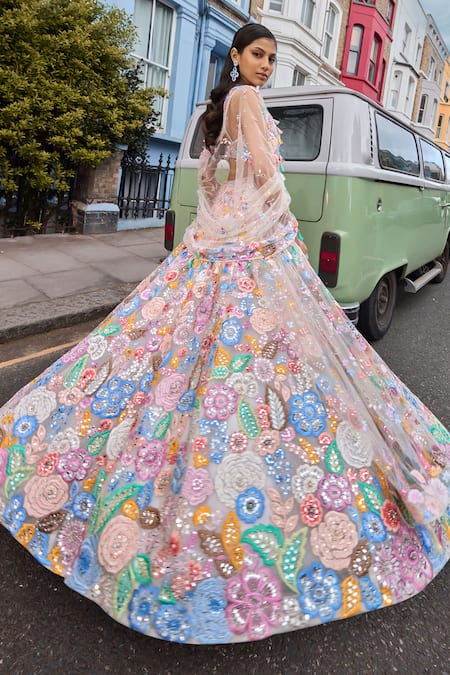 Ivory lehenga featuring multi-colored floral embroidery in thread and mirror, highlighted with sequins, beads, and pearls. Comes with an embroidered strappy padded blouse and a matching dupatta adorned with multi-colored thread tassels on all sides.