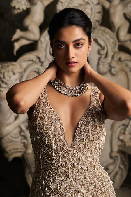 Beige Net Sequins, Stones, Pearls V-neck Embroidered Gown