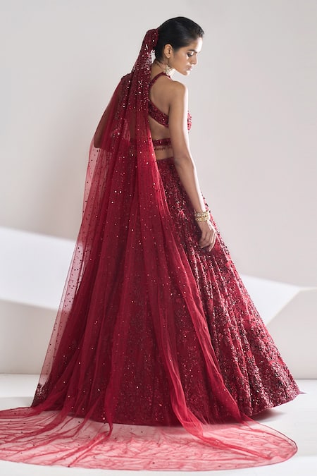 Maroon lehenga with attached cancan, features all over crystal, sequin and beads embroidery. Comes with padded blouse with a plunging neckline, tassels at the waist and a criss cross back and a matching embroidered net dupatta.