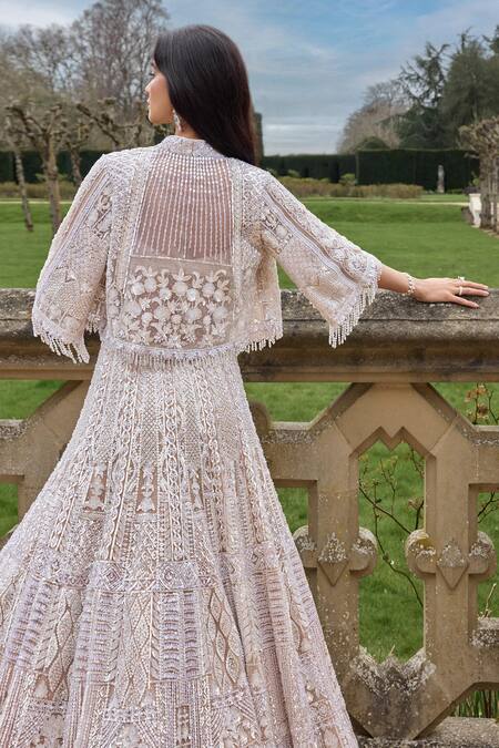 Beige lehenga set featuring a sweetheart neck padded blouse and an open jacket. The jacket is adorned with sequin, crystal, bead, and thread embroidery in a floral pattern.