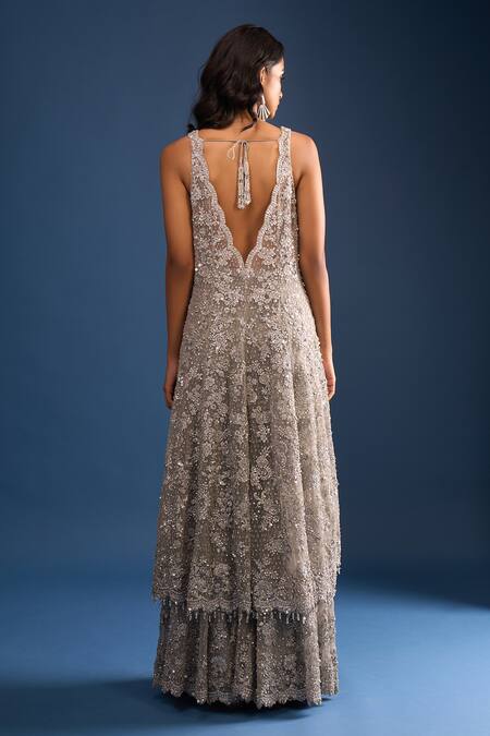 Silver net base high-low anarkali style kurta with all over dori, sequins and beads embellished in floral pattern. Paired with a matching sharara and scallop bordered dupatta.