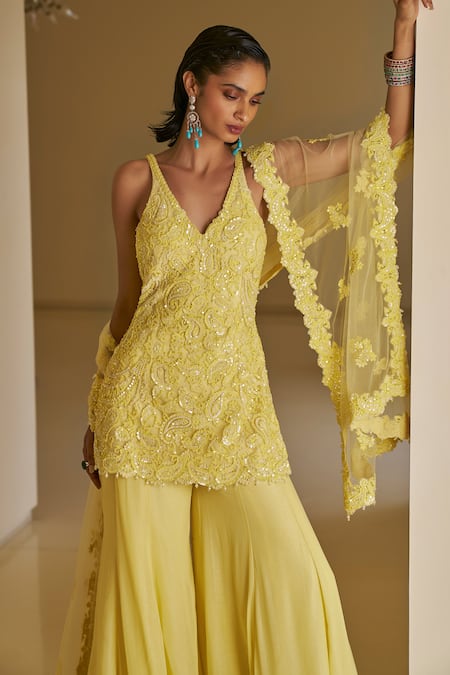 Yellow georgette tunic featuring all-over dori, sequin, and bead embroidery in paisley pattern. Paired with a matching sharara and cutwork dupatta adorned with tonal sequins embroidery.