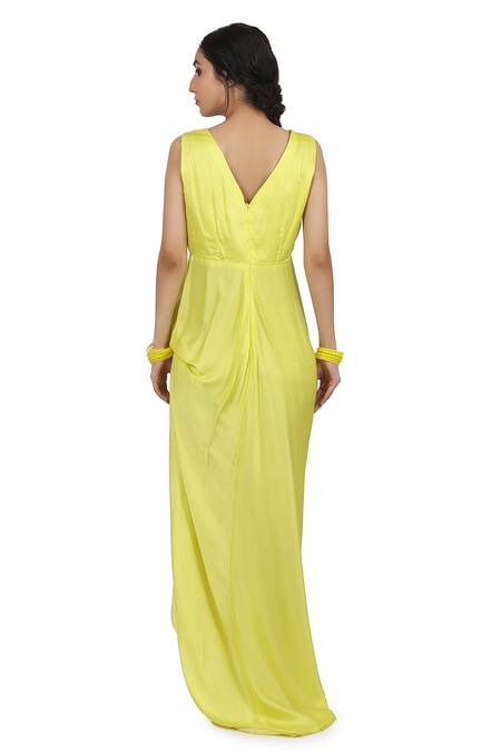 Electric yellow high-low draped dress with V neckline. Paired with resham, metallic 3D floral embroidered cape.