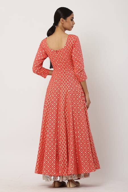 Peach anarkali in cotton mul base fabric featuring sequins embellished bodice & flared multi motif bottom. Paired cutwork hem dupatta.