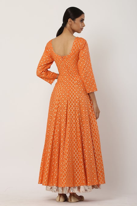 Orange anarkali in cotton mul base fabric featuring sequins embellished bodice & flared multi motif bottom. Paired cutwork hem dupatta.