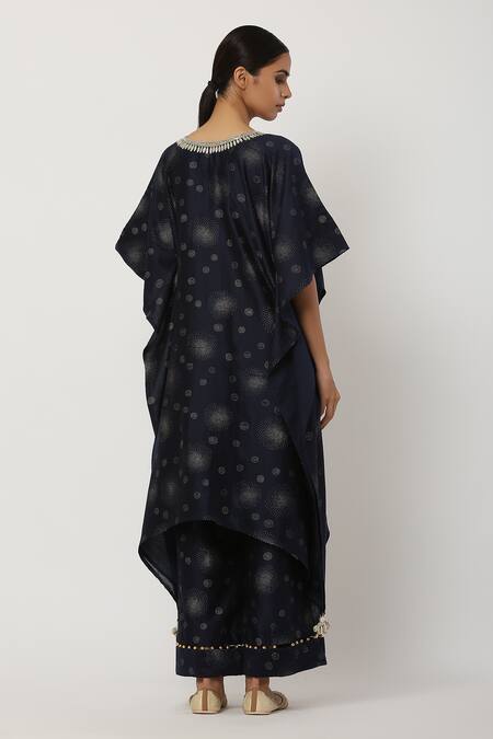 Polka dot motifs in circular pattern, Gota pati work on neckline, Side drop kaftan with tassels, Cowry shells & bead tassels, Beaded pant hem