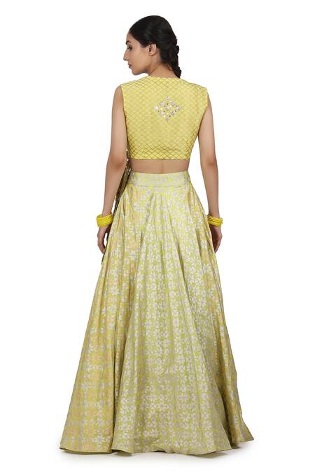Electric yellow lehenga with phulkari print. Paired with scallop print, zari embroidered cropped blouse & dupatta.