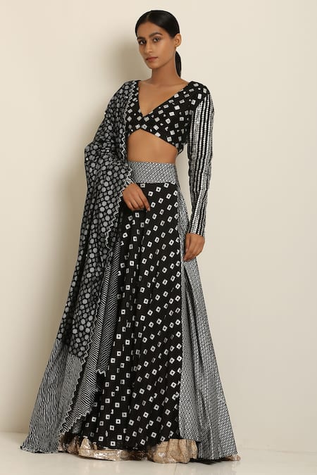 Buy_Seema Nanda_Black Cotton Mul, Uphara Silk V Neck Printed Lehenga Set_at_Aza_Fashions
