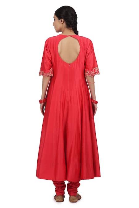 Strawberry anarkali with double pipe embroidery. Paired with stretch churidar & dupatta.