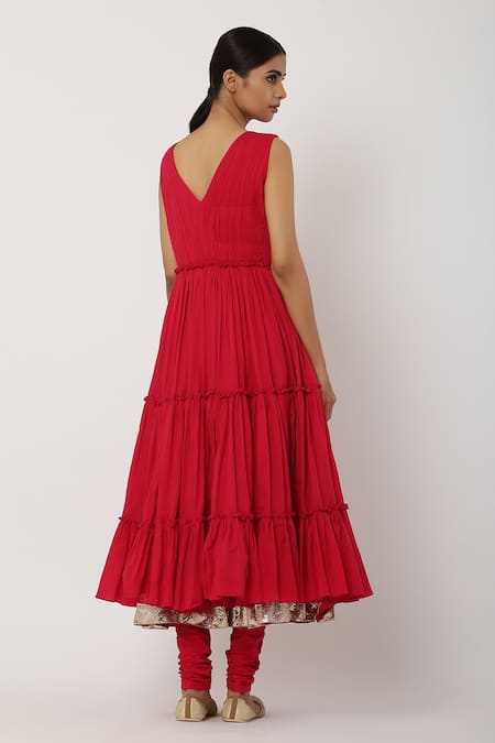 Red Chanderi Silk, , Lining V Neck Tiered Anarkali Set