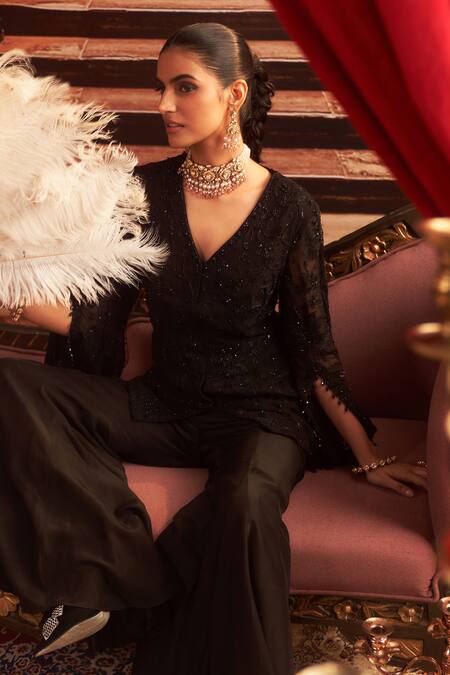 Black jacket featuring bead-sequin floral vine motifs and cape sleeves. Paired with solid flared pant for a complete look.