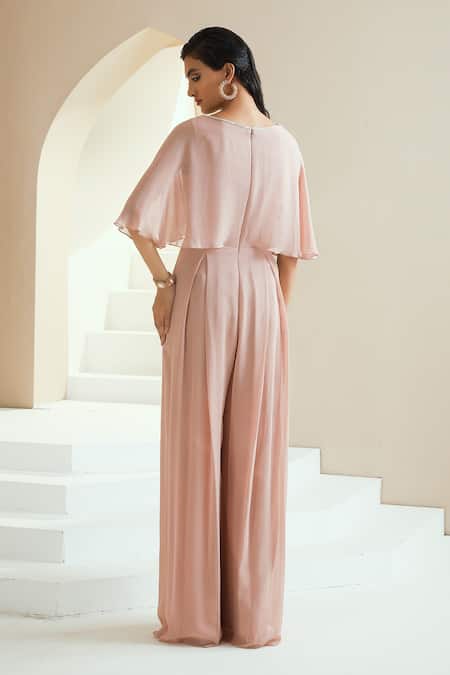 Champagne draped jumpsuit with floral patch on the waist and embroidery on neckline.