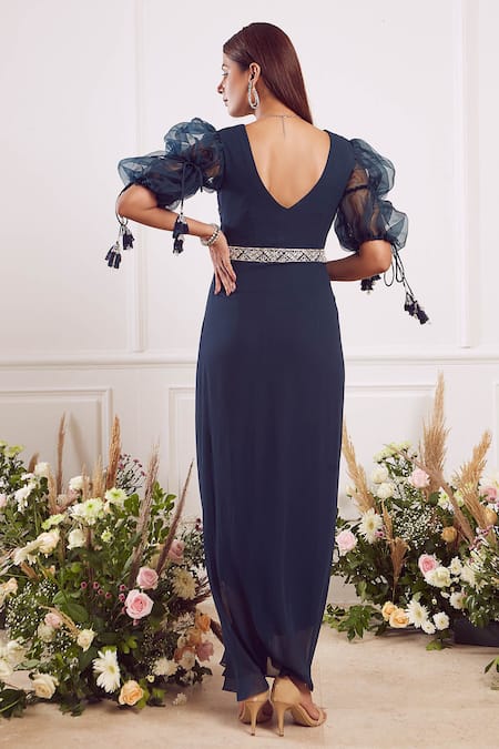 Teal green maxi gown with draped front, high-slit, placement hand embroidered with glass beads -crystals & puff sheer tassel tie-up sleeves.