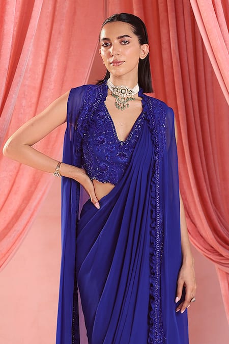 Electric blue pre-draped saree made from georgette featuring intricate embroidery with sequins and beads. Accompanied by a sleeveless blouse and an organza jacket with ruffle trims.