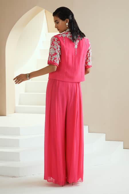 Hot pink short jacket with floral embroidery in pearls, glass beads and white beads. Comes with embroidered choli & pleated pant.