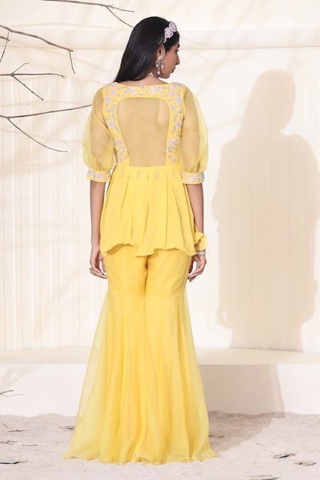 Buy_Seema Thukral_Yellow Georgette, Organza And Crepe Lining Satin Embroidered Kurta & Sharara Set_Online_at_Aza_Fashions