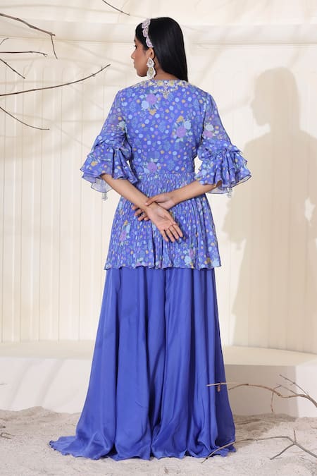 Purple peplum kurta with floral printed motifs and embroidery on the neckline. Comes with sharara.