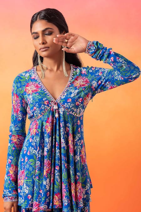 Electric blue peplum tunic featuring an all-over floral print and a V neck. Paired with a pleated floral print sharara.