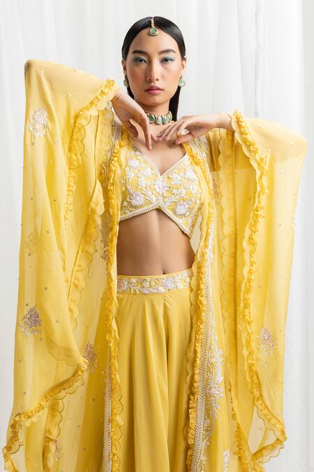 Yellow cape featuring hand embroidery with pearls, glass beads, anchor threads, and sequins. Paired with a matching inner blouse and sharara made from organza and crepe.