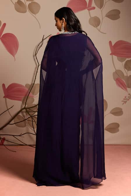Blue Georgette, Satin Embroidery Embellished Dhoti Style Draped Saree Set