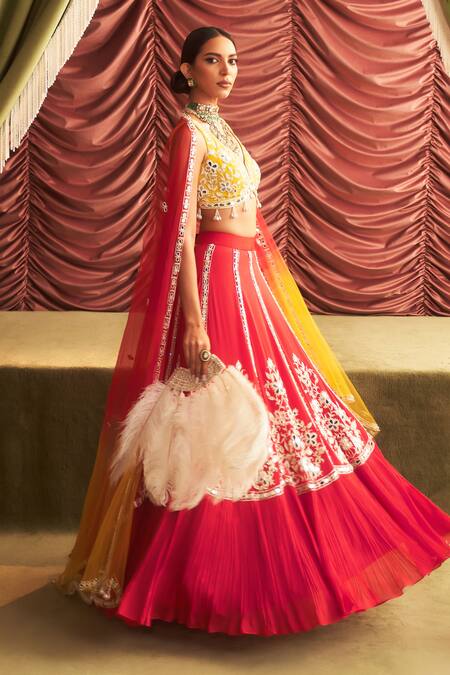 Rani pink lehenga featuring mirror, bead, thread, and cutdana embroidery in a stripe pattern. Paired with a sleeveless padded blouse and a dupatta with crystal drops and an inverted V hem.