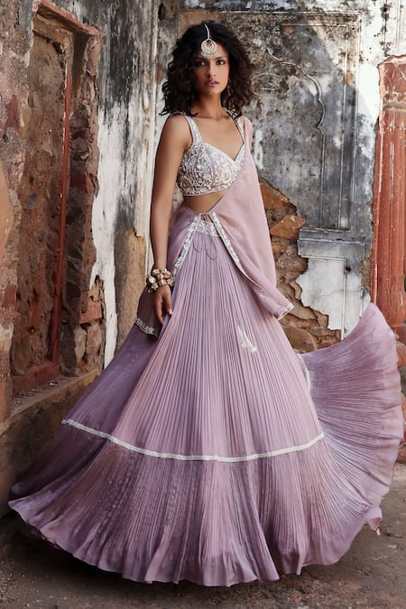 Lilac cape with embroidered border and tie-up detailing. Paired with a padded blouse featuring intricate zari, sequin, glass bead, bead, pearl, and crystal embroidery along with a tiered pleated skirt.
