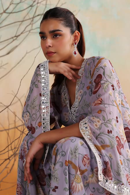 Purple floral print jacket featuring zari embroidery, sequin, bead and pearl embellishments. Paired with matching flared pants for a complete look.