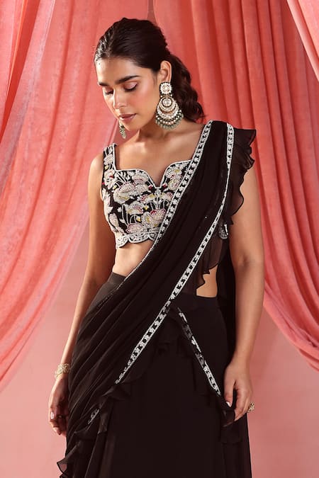 Black pre-draped lehenga saree featuring floral embroidery on the skirt and a ruffle border. Paired with a floral embroidered sleeveless blouse with a leaf neckline.