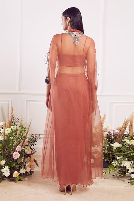 Brown front-open sheer cape paired with blouse enhanced with organza patchwork & glass bead-crystal hand embroidery. Comes with draped skirt.