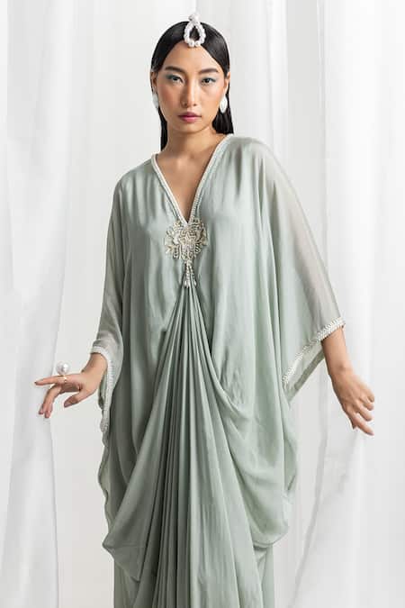 Sage green draped kaftan featuring placement hand embroidery with anchor threads, glass beads, pearls, and crystals