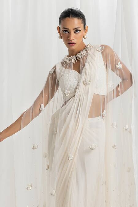 Ivory pre-draped saree featuring hand embroidery with pearls, sequins, glass beads, and white beads. Accompanied by a sleeveless blouse with a leaf neckline and a longline semi-sheer cape with embroidered buttis.