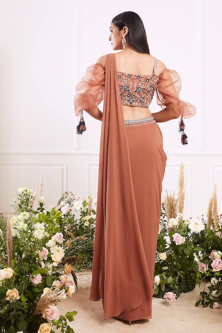 Brown pre stitched saree paired with bead-crystal embellished blouse enhanced with puff organza sleeves & finished with tassels. Comes with belt.