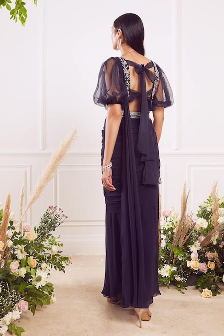 Navy blue pre-draped saree paired with blouse enhanced with patch work organza, hand embroidered glass beads, crystals - sequins. Comes with belt.