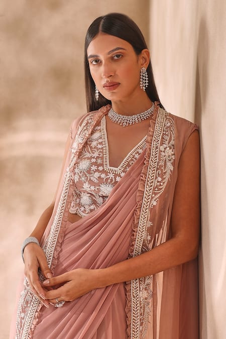 Dusty pink pre-stitched saree featuring floral embroidery and ruffle detailing. Paired with an embroidered blouse and an open jacket made from organza and satin lining.