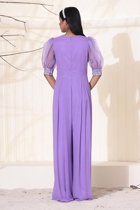 Seema Thukral_Purple Georgette, Organza, Satin Beads, Sequins Puff Sleeves Jumpsuit_Online_at_Aza_Fashions