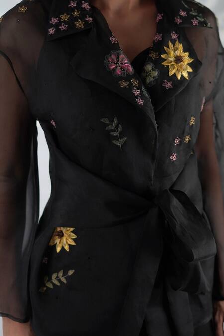 Black sheer jacket featuring floral applique embroidery and scatter work