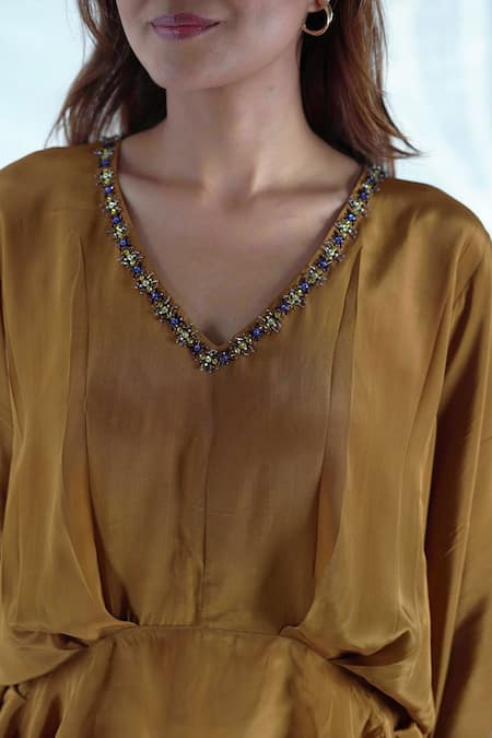Brown Crepe Embroidery V-neck Arela Kaftan Blouse