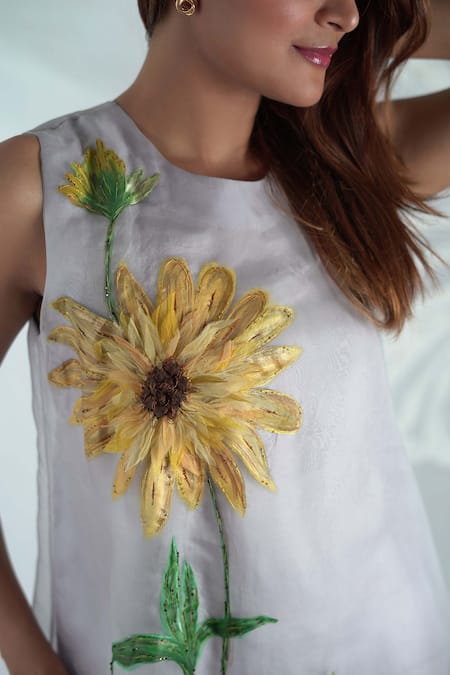Grey organza maxi dress featuring hand-painted sunflower applique work