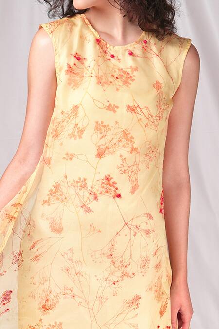Cream Organza, Silk Beads Round Neck Floral Print Layered Maxi Dress