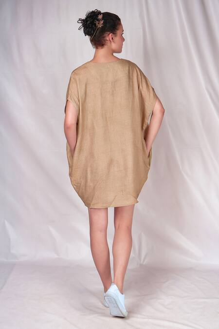 Beige linen dress featuring floral motifs and side pockets