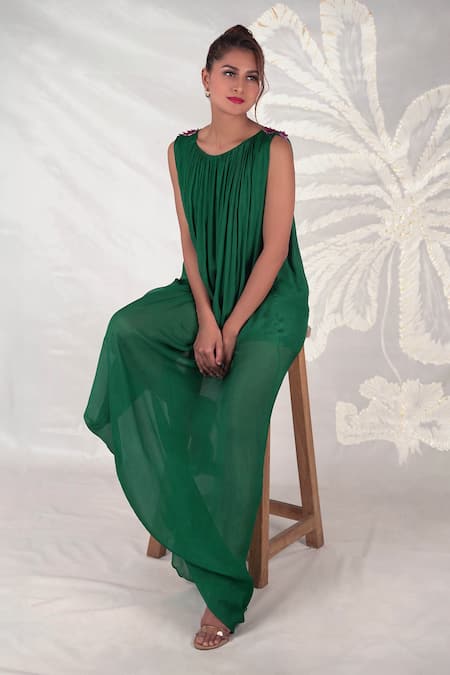 Green Chiffon Fabric Flowers Round Neck Naida Crinkled Long Dress