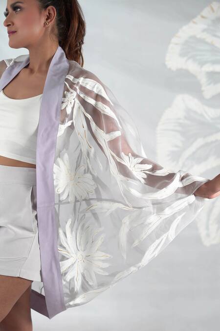 Grey Silk Organza Embroidery Open Neck Ziara Hand Painted Sunflower Jacket