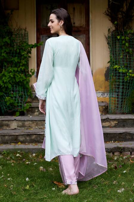 Blue muslin silk kurta set featuring an angarkha style top. Paired with matching pants and a dupatta.