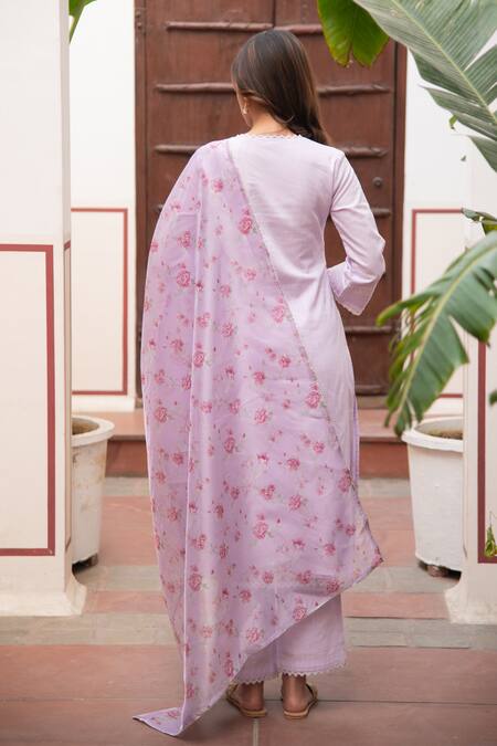 Purple muslin silk kurta featuring intricate lace detailing and a v-neckline. Paired with matching pants and a floral printed dupatta.