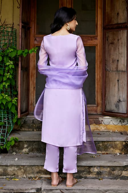 Purple Organza, Muslin, Silk, Cotton Embroidery Round Almiza Kurta Pant Set