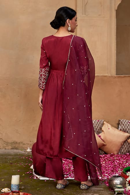 Maroon muslin silk gathered kurta featuring floral and thread embroidery. Paired with a matching pant and an embroidered organza dupatta.