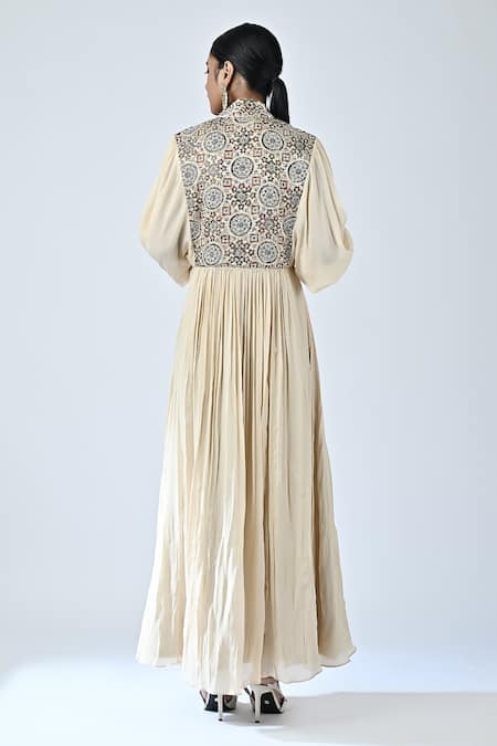 Buy_Sejal Kamdar_Beige Crepe Zari, Embroidery High Neck Ajrakh Print Yoke Gathered Dress _Online_at_Aza_Fashions